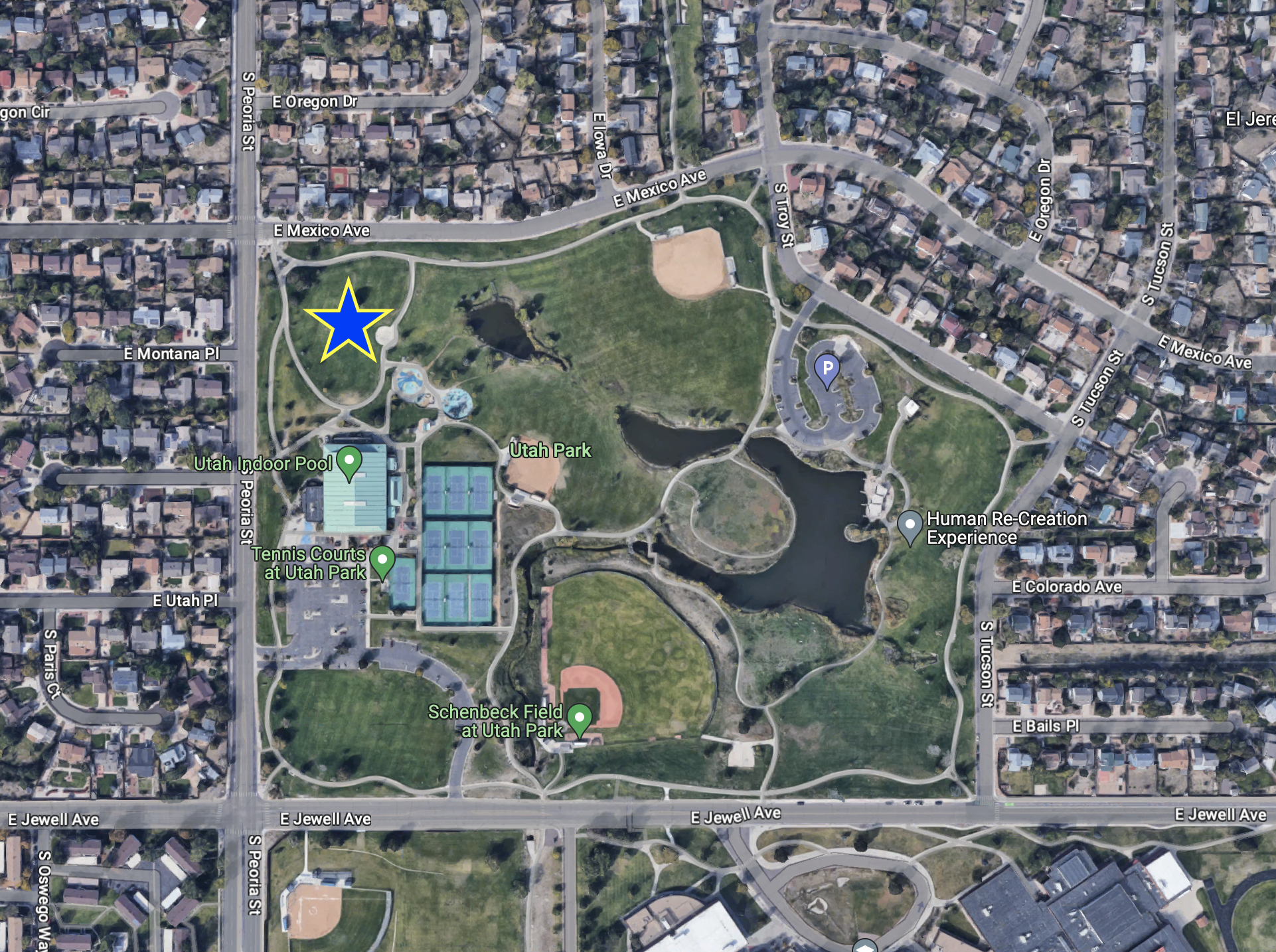 We suggest parking near the intersection of Tennessee and Downing. Parking will be on nearby streets as well as some in the center of the park near the playground, but all is free. Class is north of the basketball court on the lawn. Take the small foot bridge near that intersection and cross the creek in to the park. Once you get across the creek, if you look slightly to your left you will see some tennis and basketball courts. We hold classes in the grass just to the north of the basketball courts. See gray pin on the map below.
